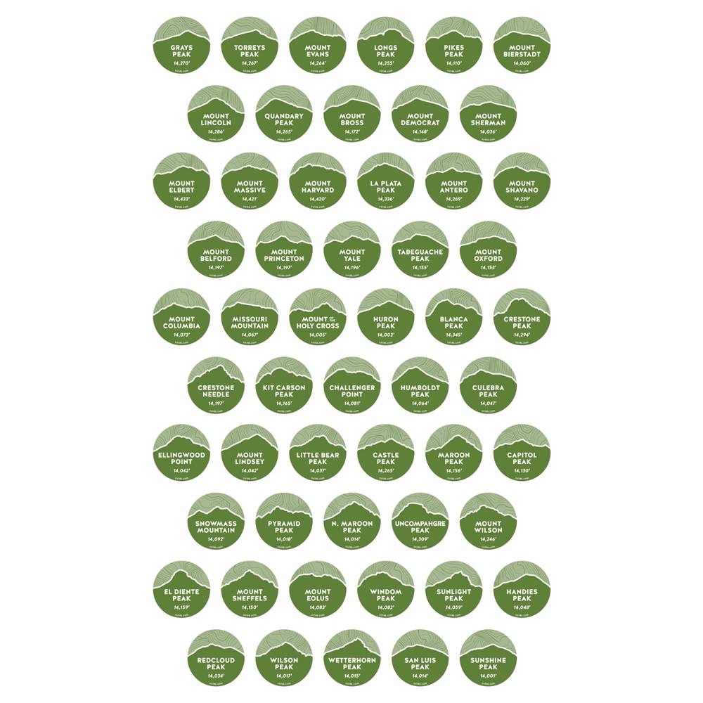 Meticulously designed 2" x 2" Colorado 14er stickers. Each one is as different as the summit it represents, containing the unique summit profile and elevation, silhouetted in front of a custom topographic background. What better way to display your accomplishments than with distinct summit stickers on your water bottle, vehicle, coffee mug, or computer case.