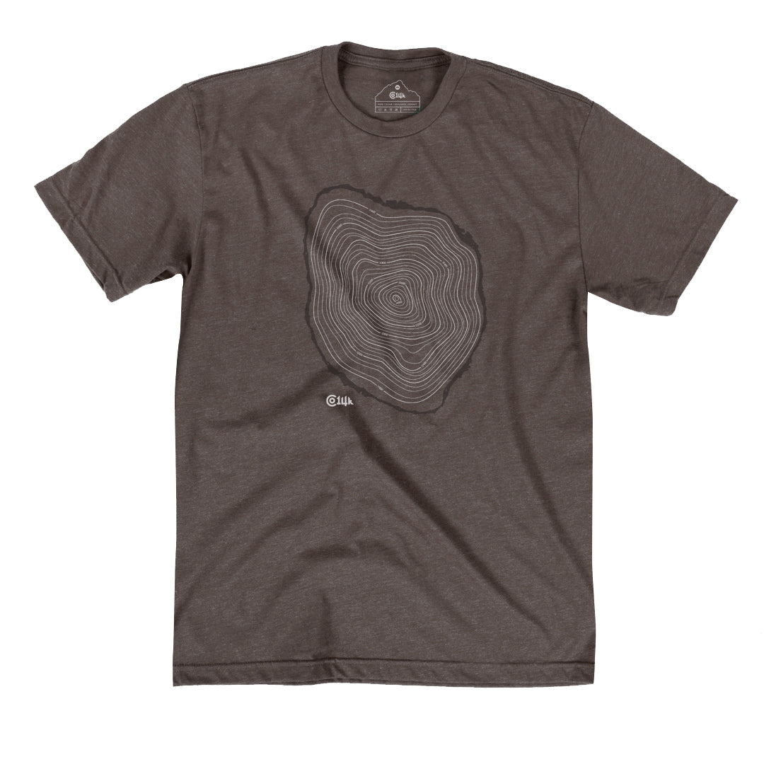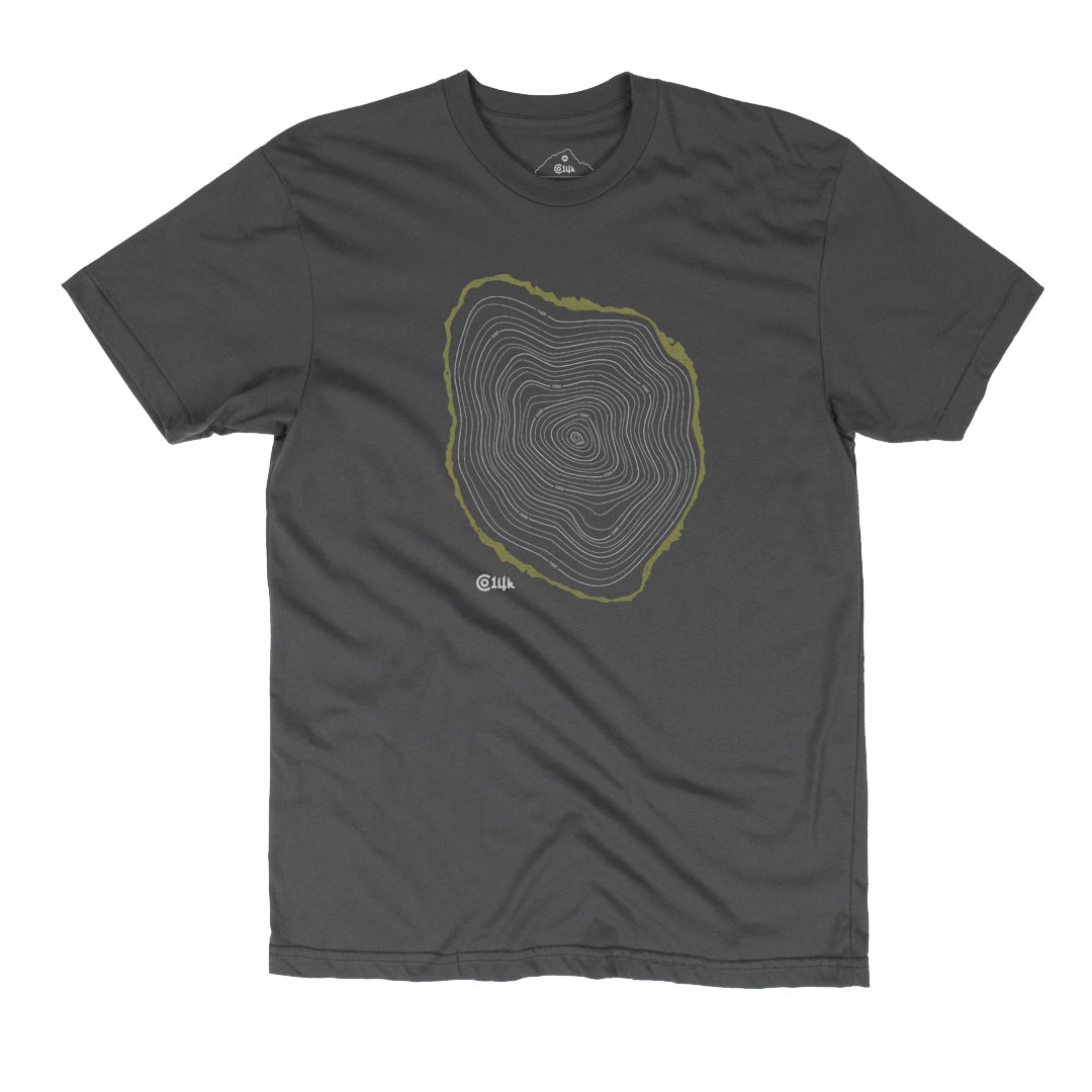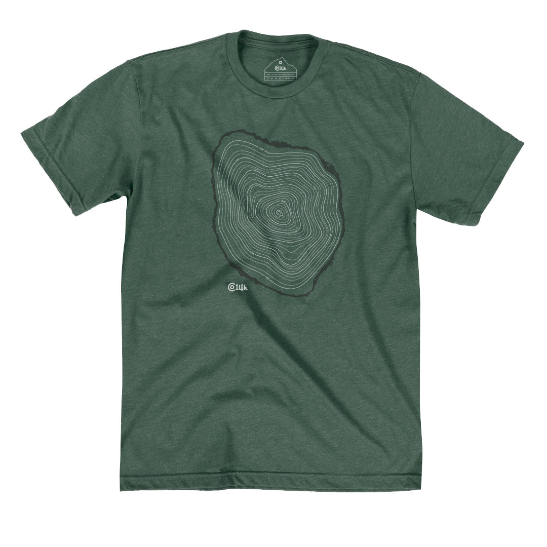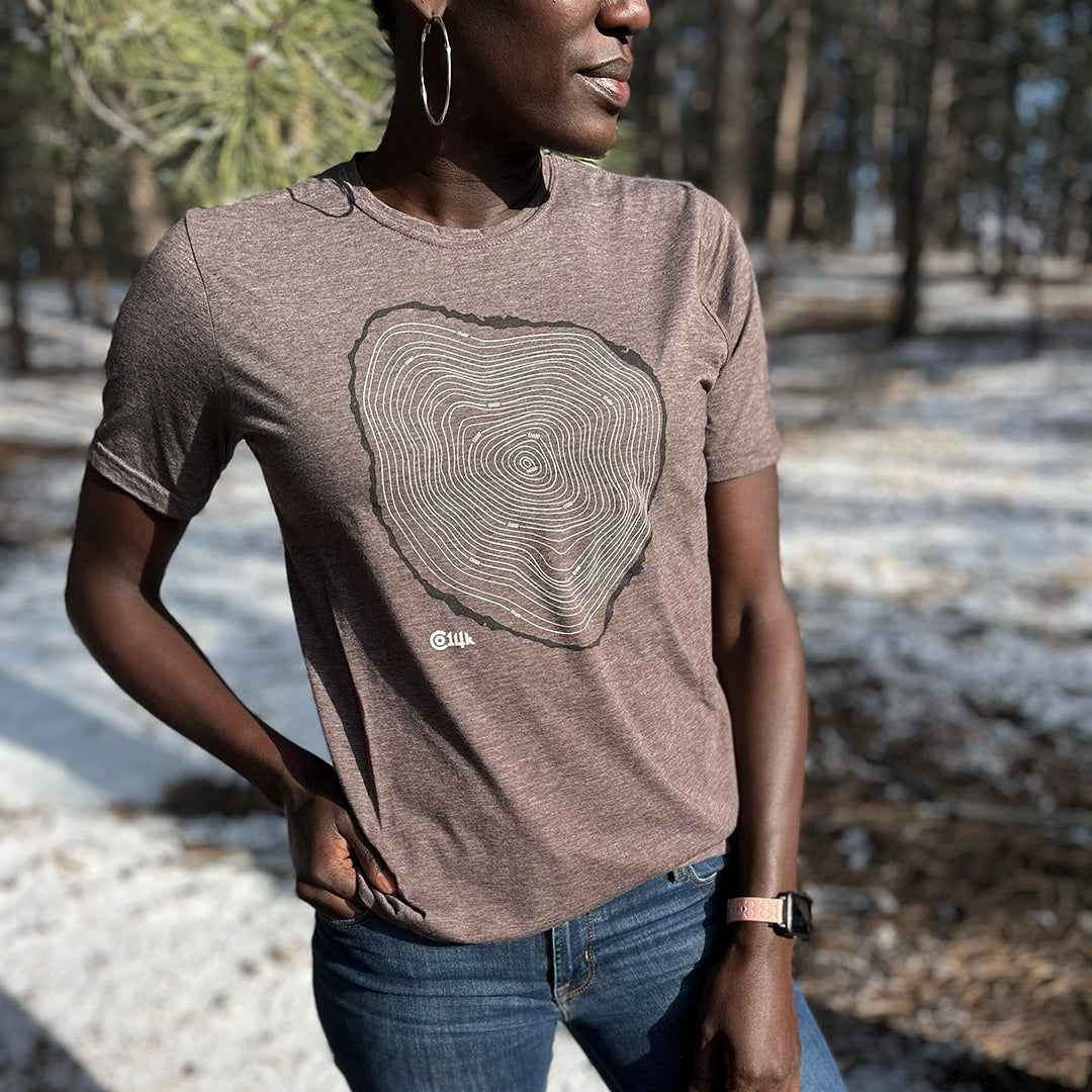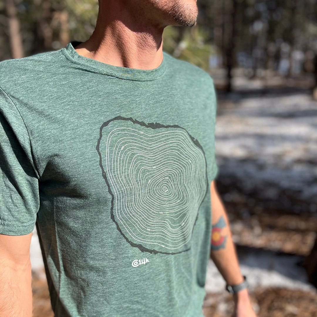 Ah, the tree line – that magical elevation where the sky opens up, the summit comes into view, and the potential risk rises 😬 😅 Show off your elevated knowledge of alpine environments with this Tree Line T. The rings within the cross-section design mimic the topographic lines of a map. Beginning with the outer bark at tree line (roughly 11,500' in CO) and extending to 14,000'+ in the center.