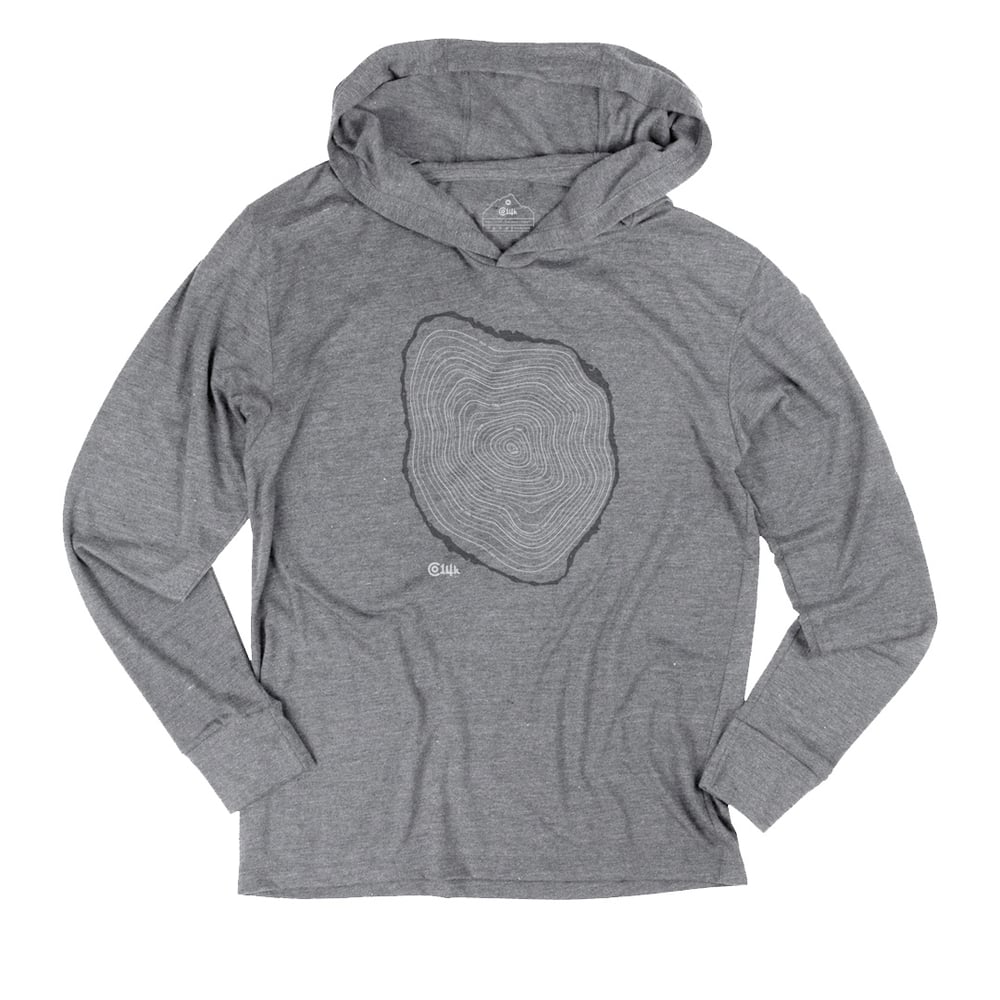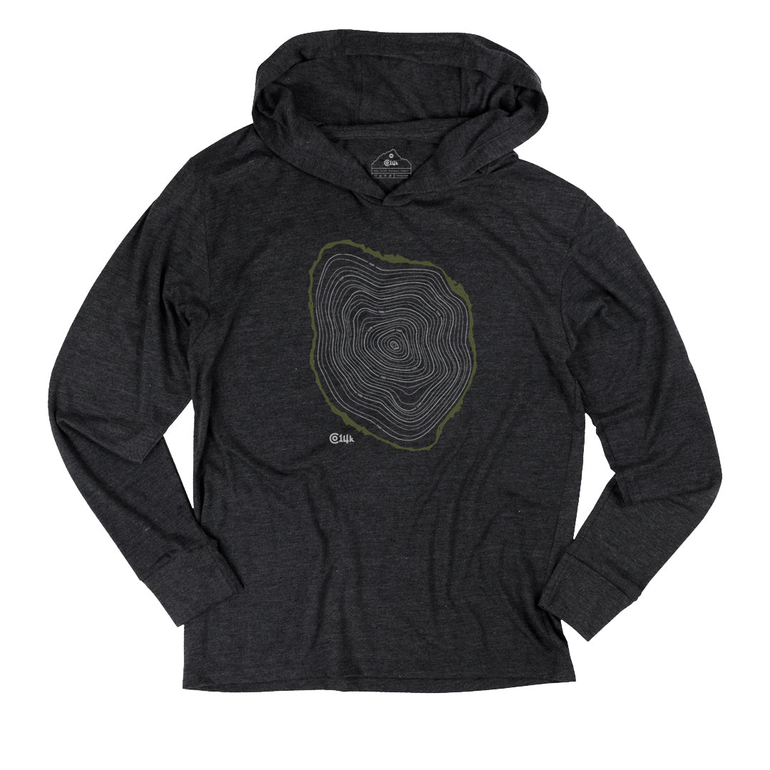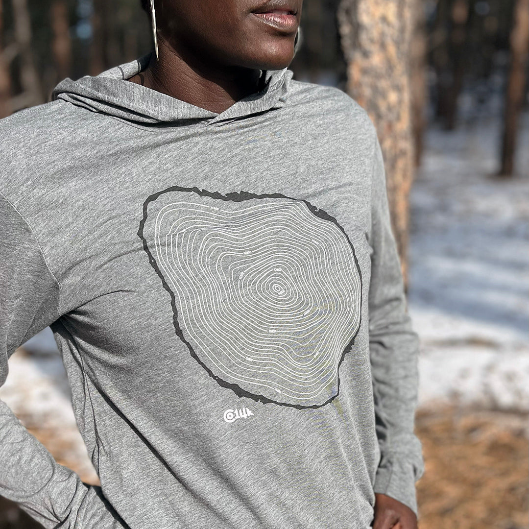 Ah, the tree line — that magical elevation where the sky opens up, the summit comes into view, and the potential risk rises 😬 😅 Proudly share your elevated knowledge of alpine environments with this tri-blend hoodie. The rings within the cross-section design mimic the topographic lines of a map. Beginning with the outer bark at tree line (roughly 11,500' in CO) and extending to 14,000'+ in the center.